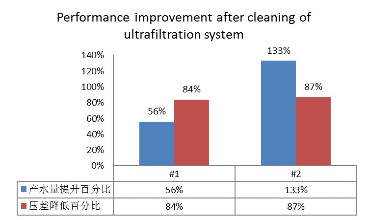After cleaning and sterilization of the system, the water yield rate increase by 56% ~ 133%, the differential pressure of ultrafiltration system decreased by 84%~87%, The system performance was obviously restored, the sterilization effect is good, and the growth of microorganisms has been effectively controlled.