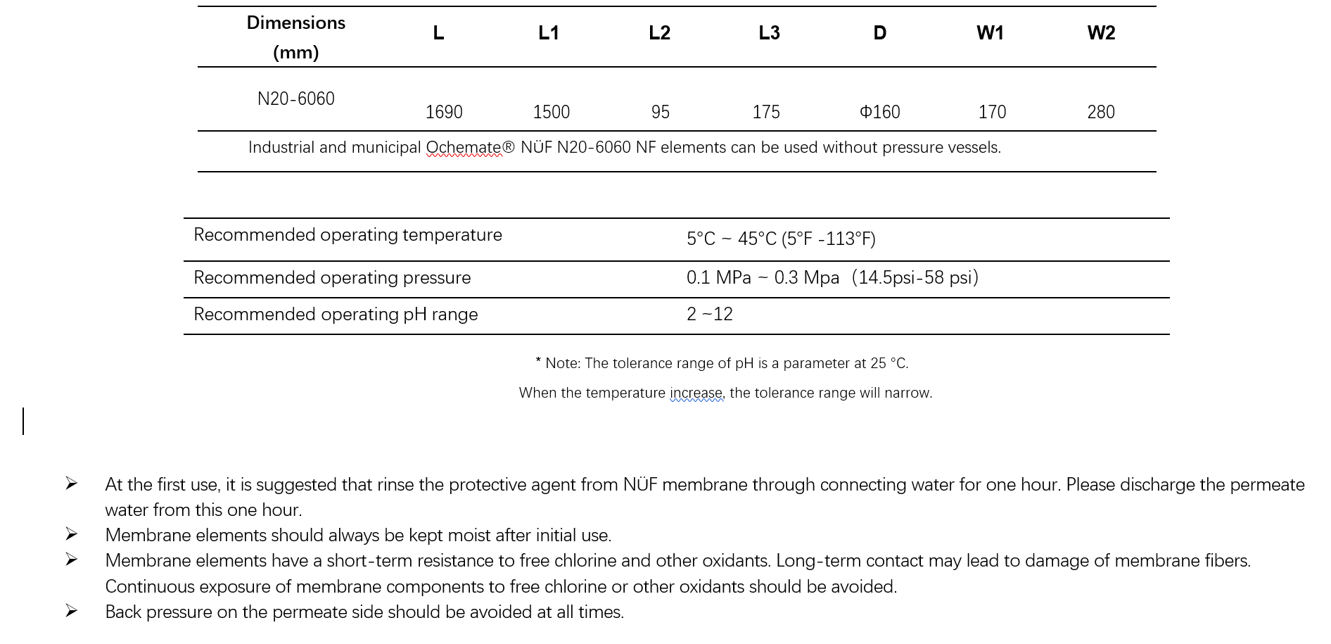 At an operating pressure of 1.0 bar, the flux can exceed 30 L/m2 * h; Compared with similar products, the operating pressure of Ochemate ® NÜF N20-6060 hollow fiber nanofiltration membrane is more than 35% lower at the same flux.